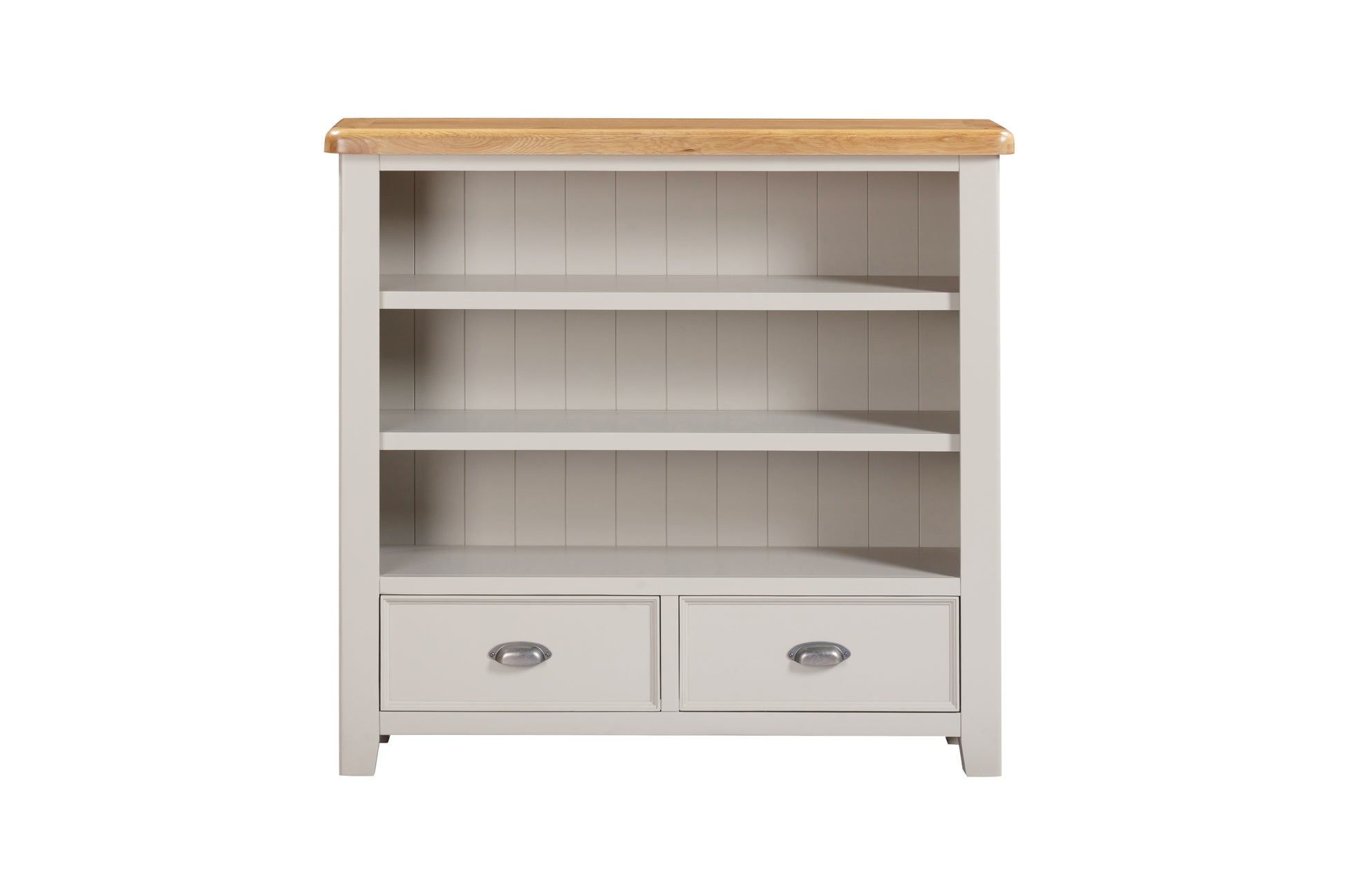 The Kingsbury Painted Low Bookcase, the base is painted in light gray, the top is a warm, rustic oak finish, smooth rounded corners, retro cup handles and panelling which gives the range a traditional appeal for the modern home.
